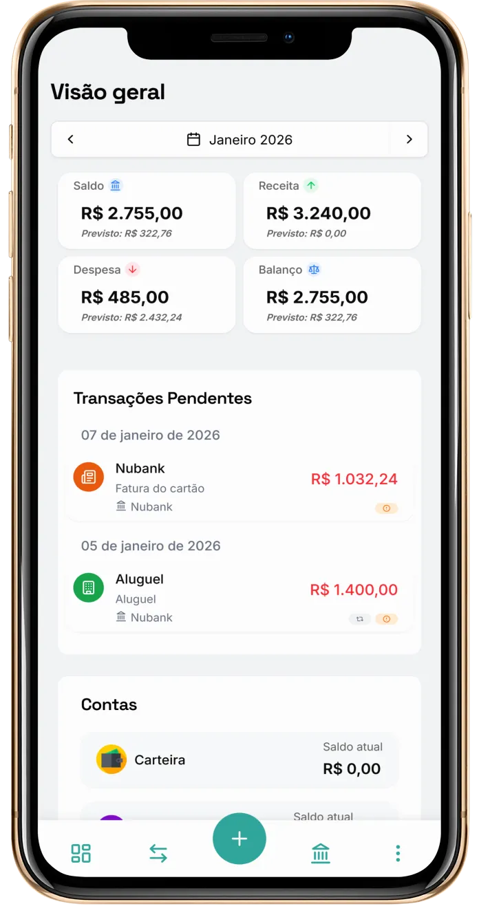 Organize seus gastos, acompanhe cartões de crédito, planeje seu orçamento mensal e tome decisões financeiras melhores — tudo em um único lugar.